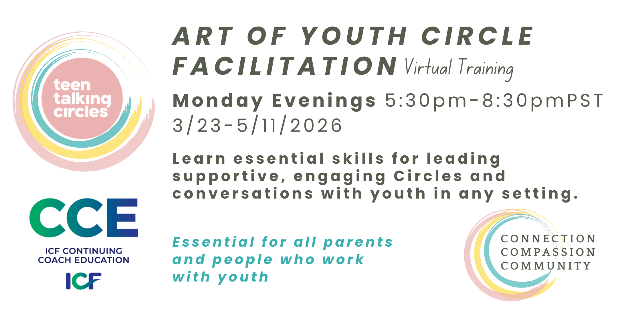 Join us for a transformative 8-week virtual online training beginning in March and gain the essential skills to lead youth Circles that foster emotional growth, connection, and resilience. For over 30 years, Teen Talking Circles has been empowering youth by creating safe, judgment-free spaces where they can express themselves authentically and build the confidence they need to navigate life’s challenges. Whether you’re a parent, educator, or community leader, this training will equip you to lead meaningful conversations and create supportive environments for youth in any setting. Experience the power of facilitation firsthand and connect with a global community of like-minded facilitators dedicated to making a positive impact. Don’t miss your chance to be part of this life-changing experience! Email us at info@teentalkingcircles.org with any questions.Date: Mondays, March 23rd - May 11th Time: 5:30pm PST - 8:30PM PST Tickets: $449- $799 (limited scholarships available) Location: Online Age: Adults 19+ Questions? Email info@teentalkingcircles.org Register: Youth Facilitation Training on Eventbrite